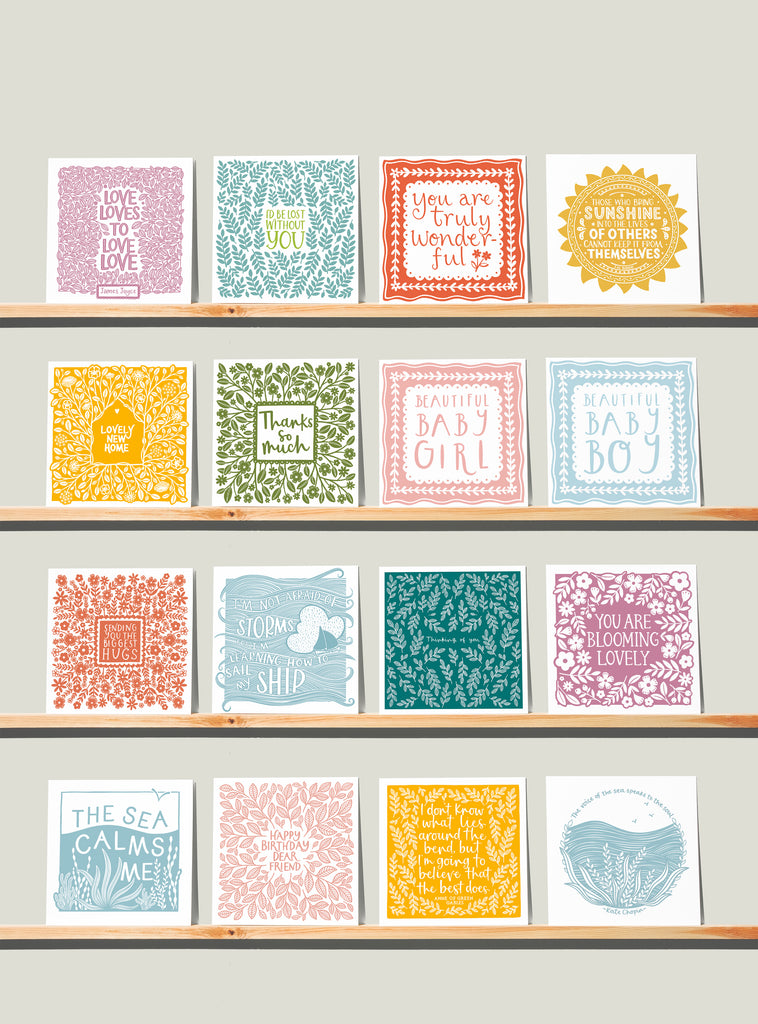 Our favourite places and quotes, designed and screen printed by us on recycled paper.